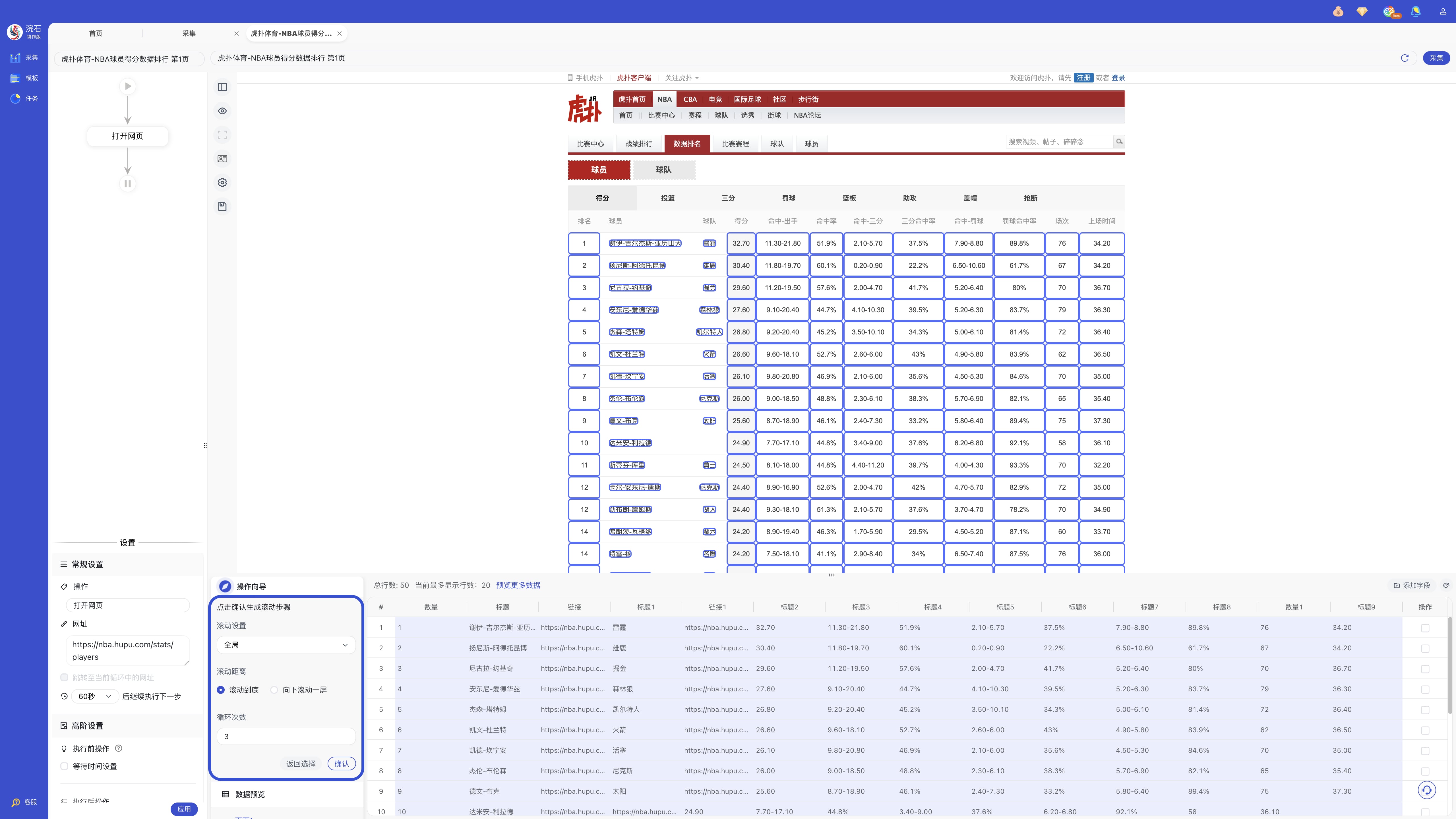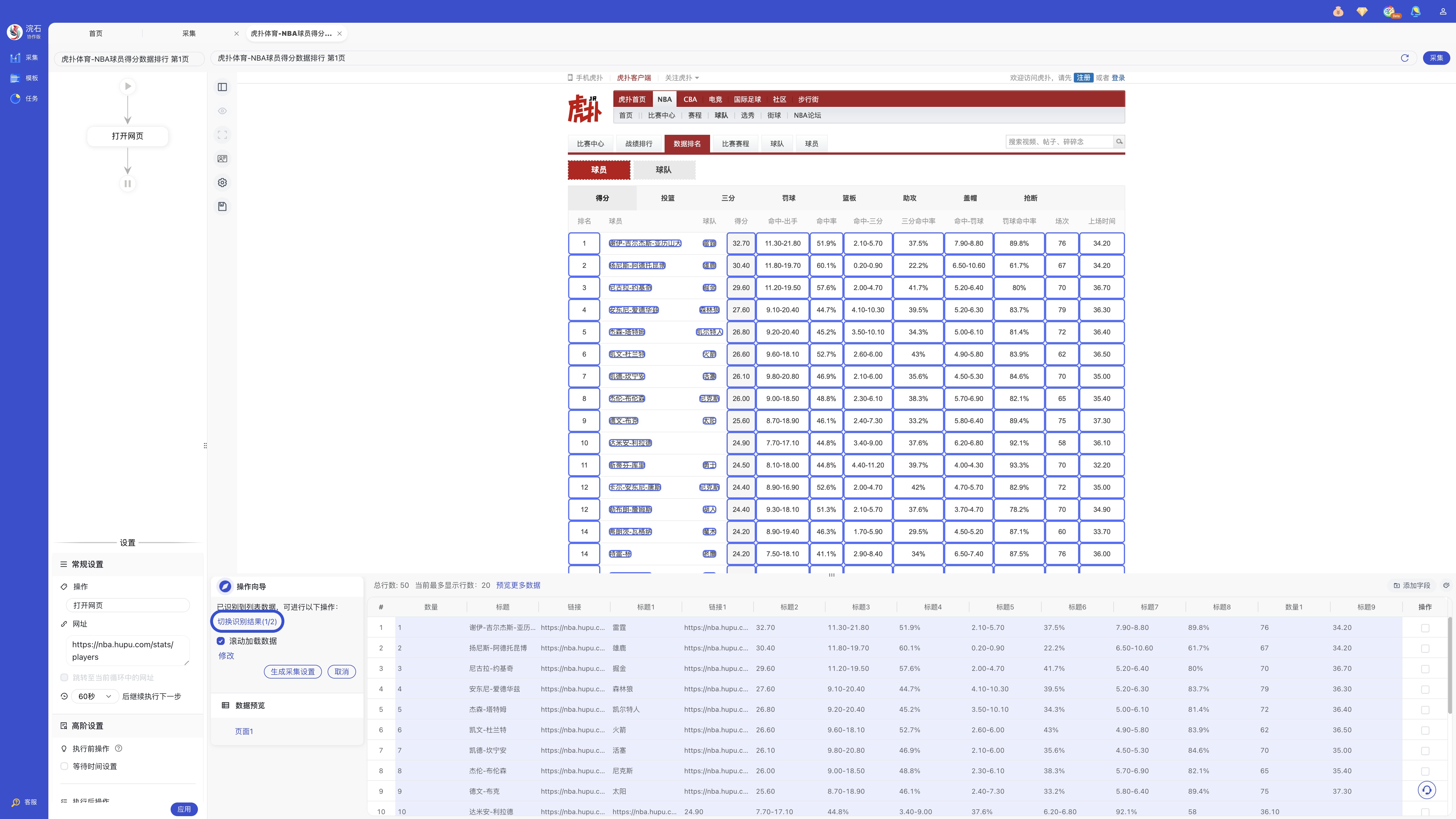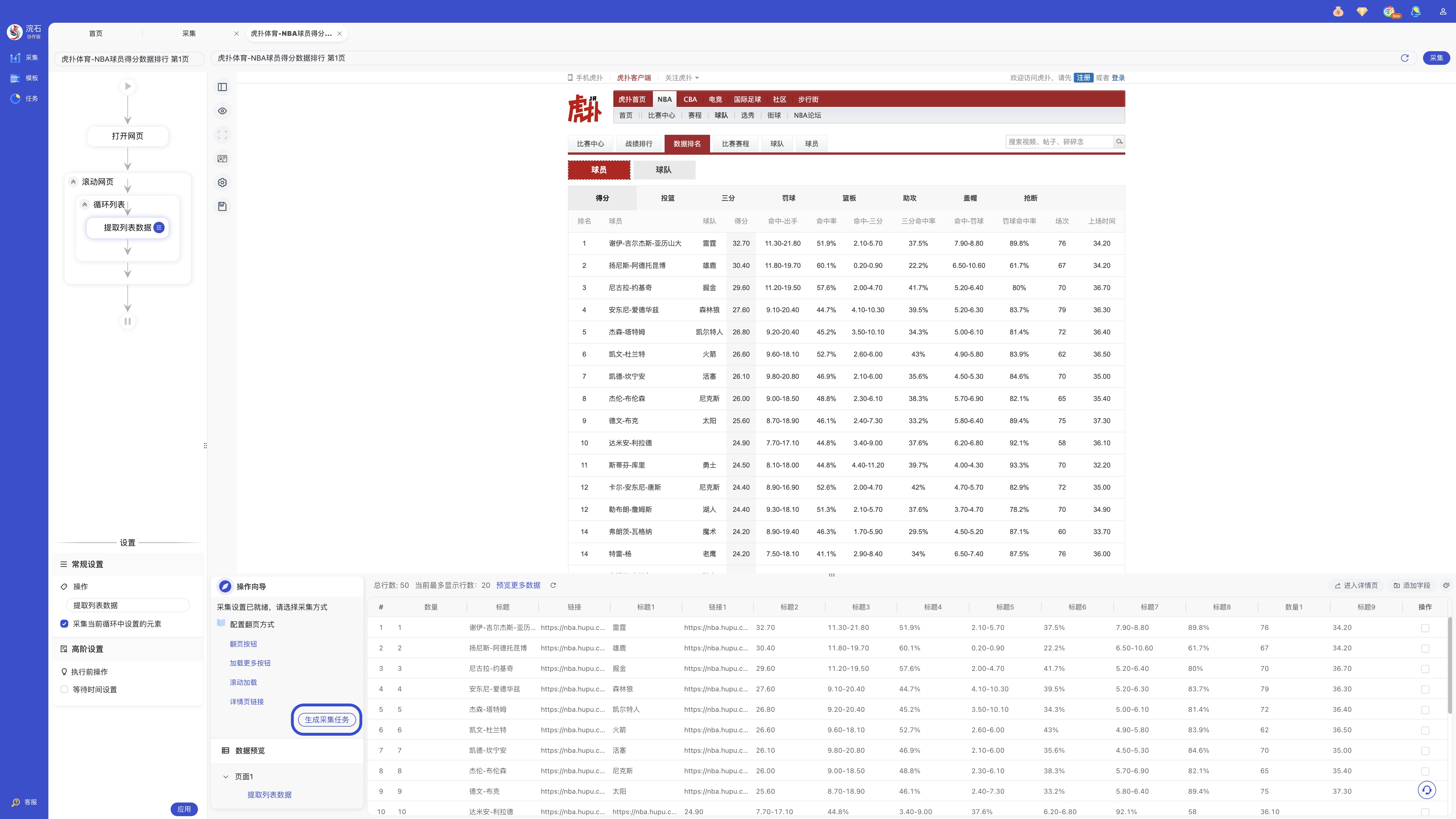 步骤一:输入目标网址,示例网址为https://nba.hupu.com/stats/players,点击「开始采集」或按回车键进入自定义采集页。