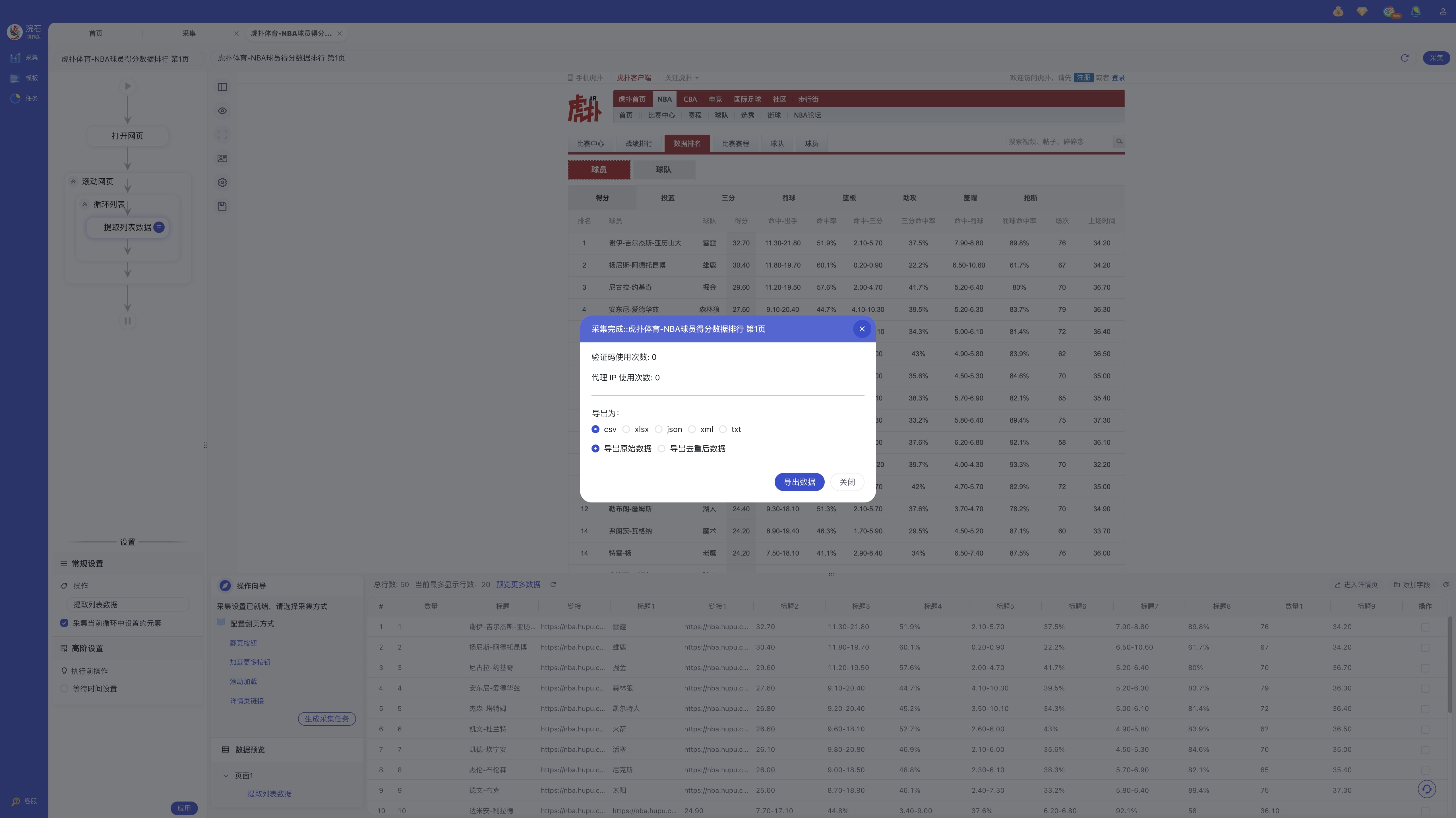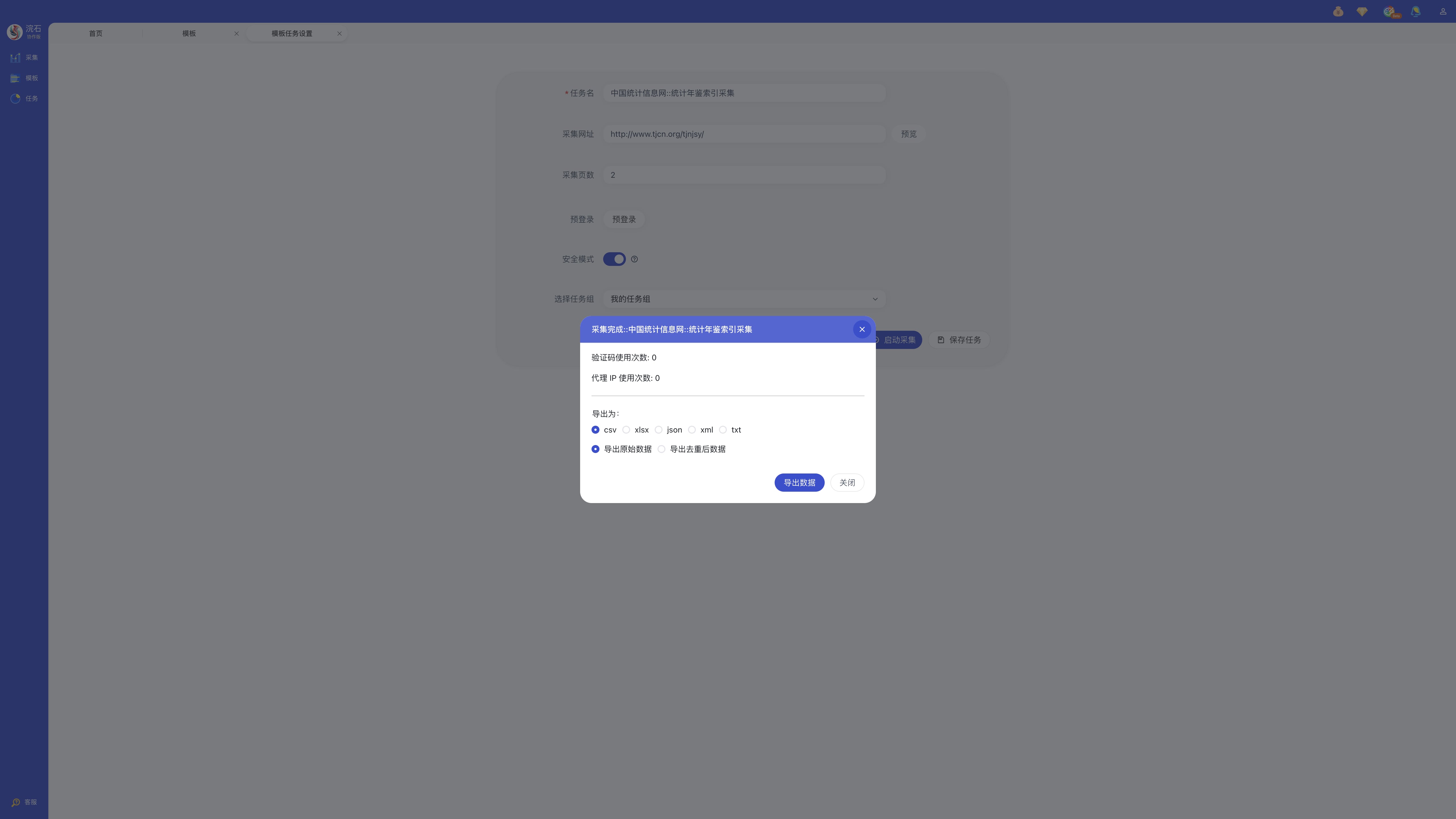 设置完所有步骤后,点击「生成采集任务」或点击右上角「采集」开始采集网页数据。采集完成后,可选择「导出数据」或「关闭」