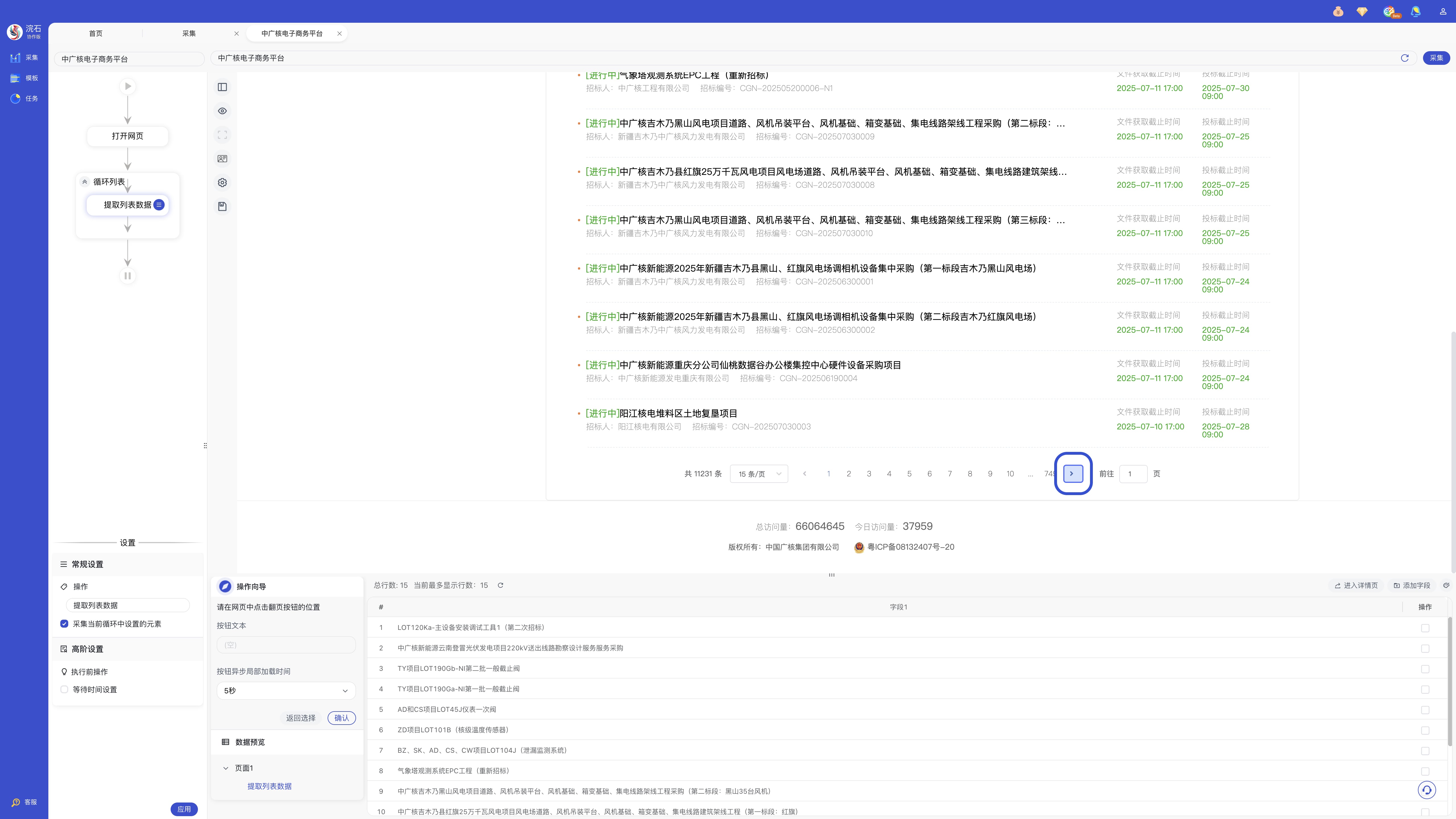 选择「提取全部相似元素」并提取数据后可看见底部数据预览部分出现数据,此时可根据网页配置翻页方式,实现多页数据采集。