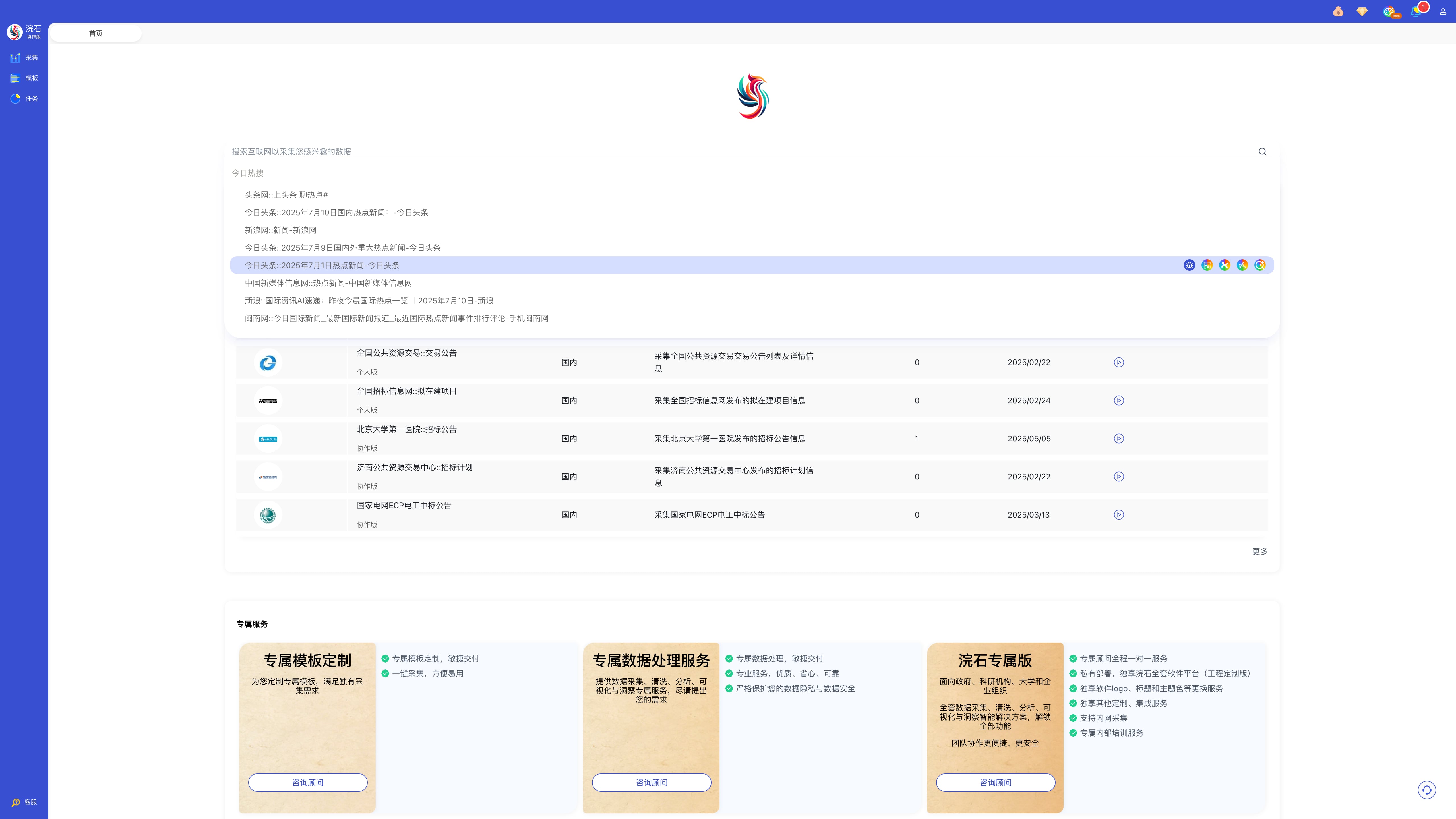 您可以在搜索框中输入您感兴趣的数据后,点击搜索图标或按回车键,下拉框会展示匹配的搜索结果。点击列表项可在浏览器中浏览对应网址,此外,您还可以进行自定义采集、网页总结、网页生成思维导图、知识图谱和深度搜索。