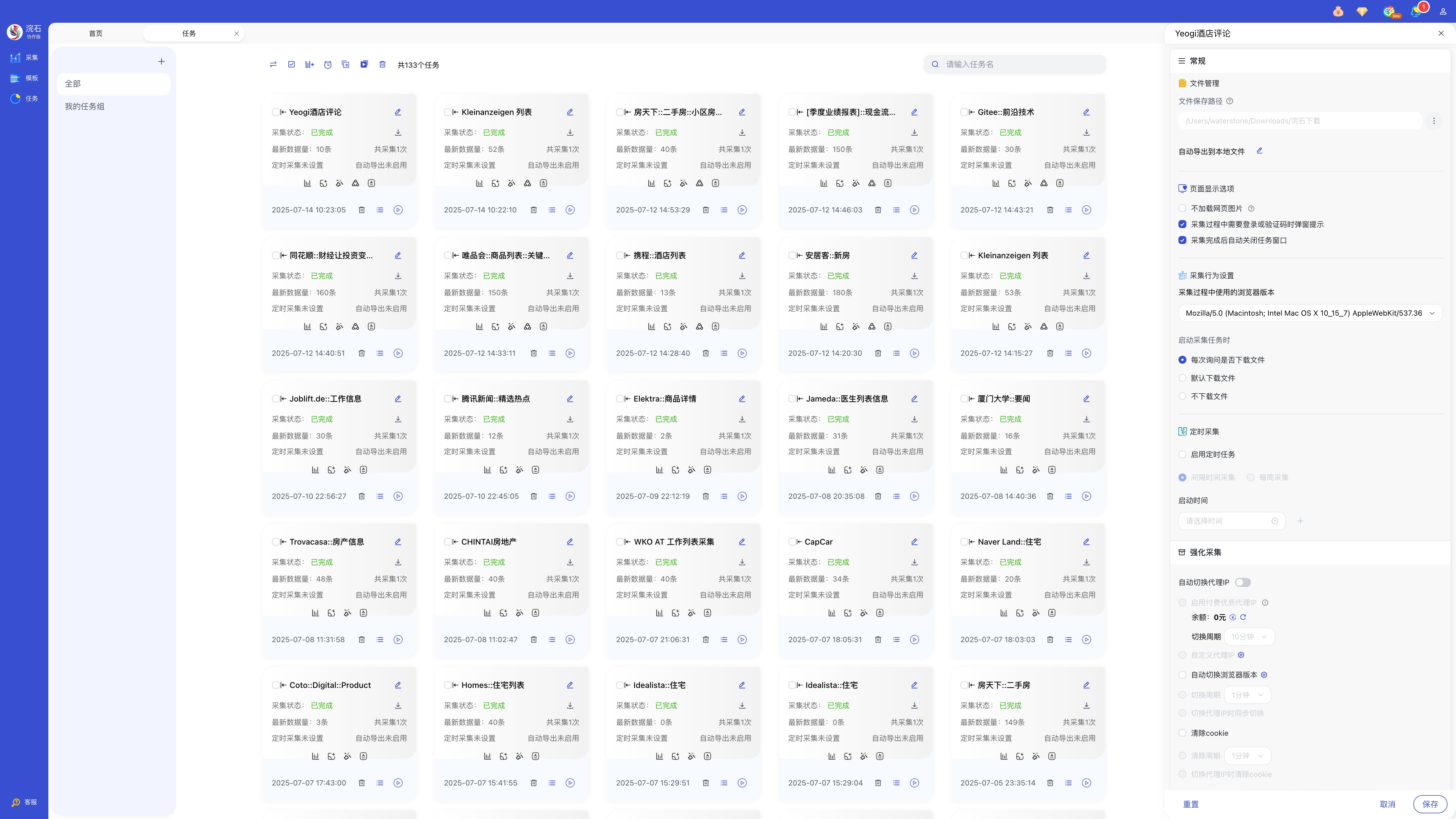 浣石采集器提供灵活多样的采集任务设置,满足您最苛刻的数据采集需求,包含了定时采集,强化采集,数据导出与智能分析等功能。