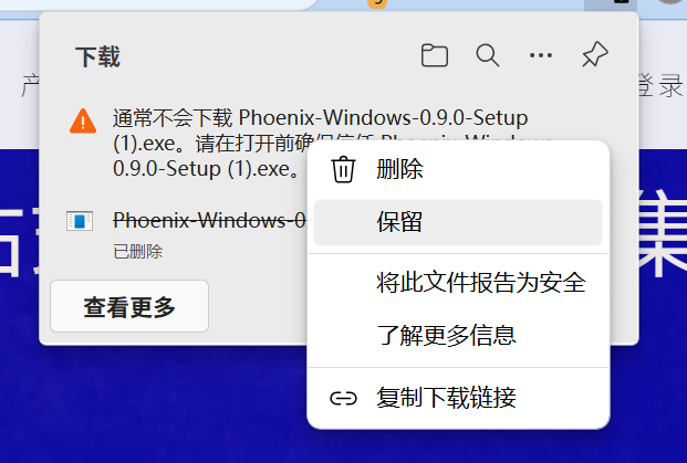 如果您在下载时看到浏览器或 Windows 提示“此文件可能不安全”或“未识别的发布者”,请按以下步骤操作: