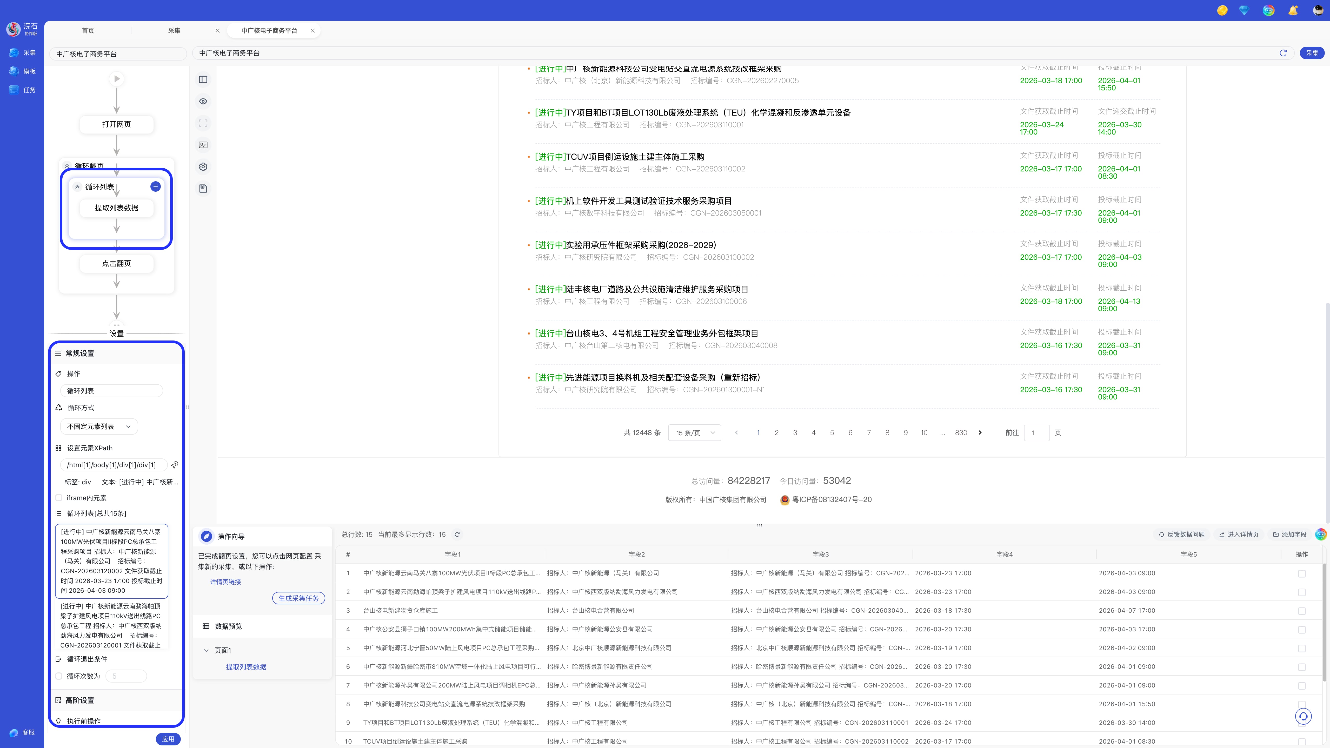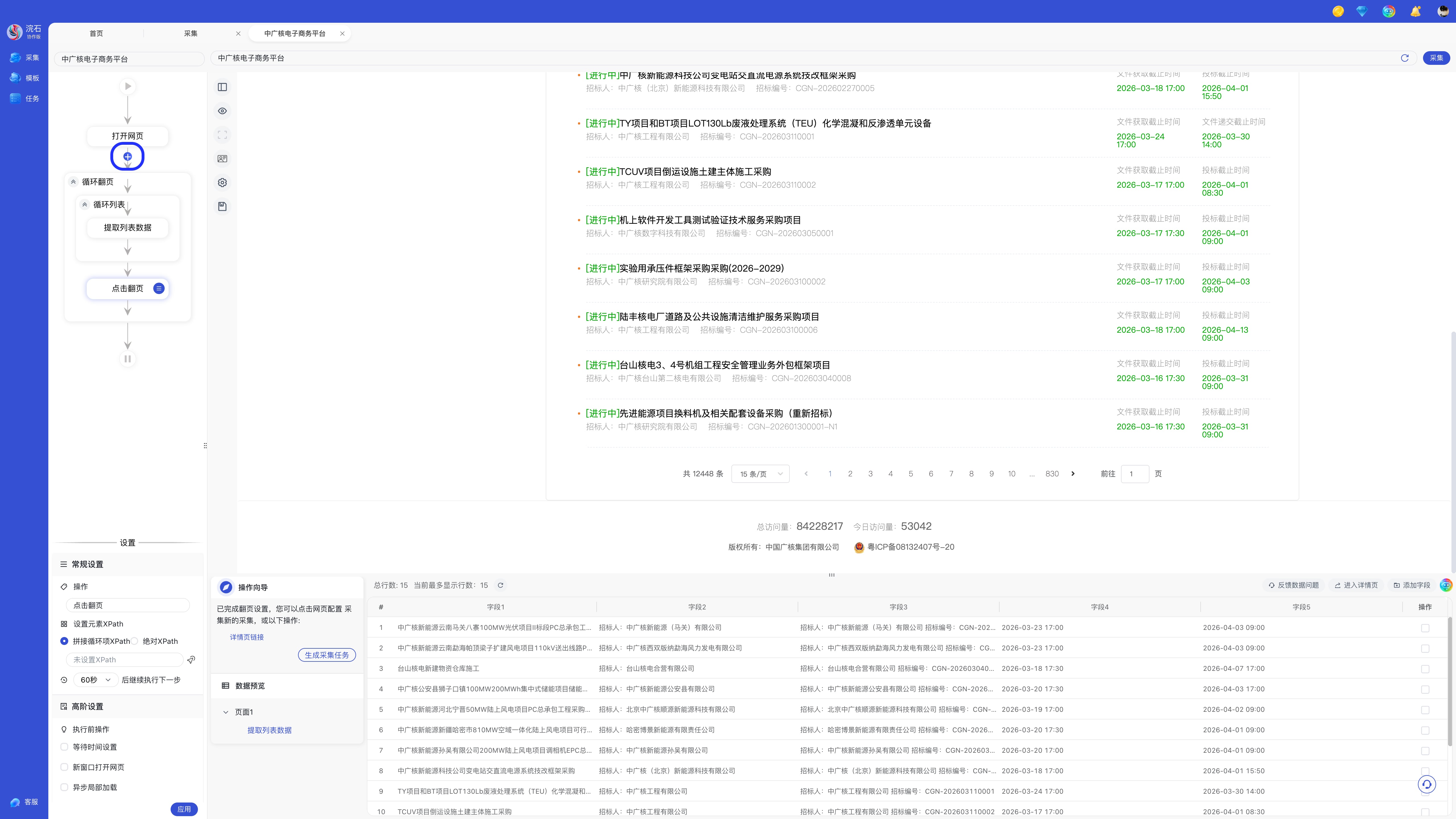 进入采集页后,左侧显示流程图与设置,底部是操作向导与数据预览,目前没有配置规则,所以数据为空。