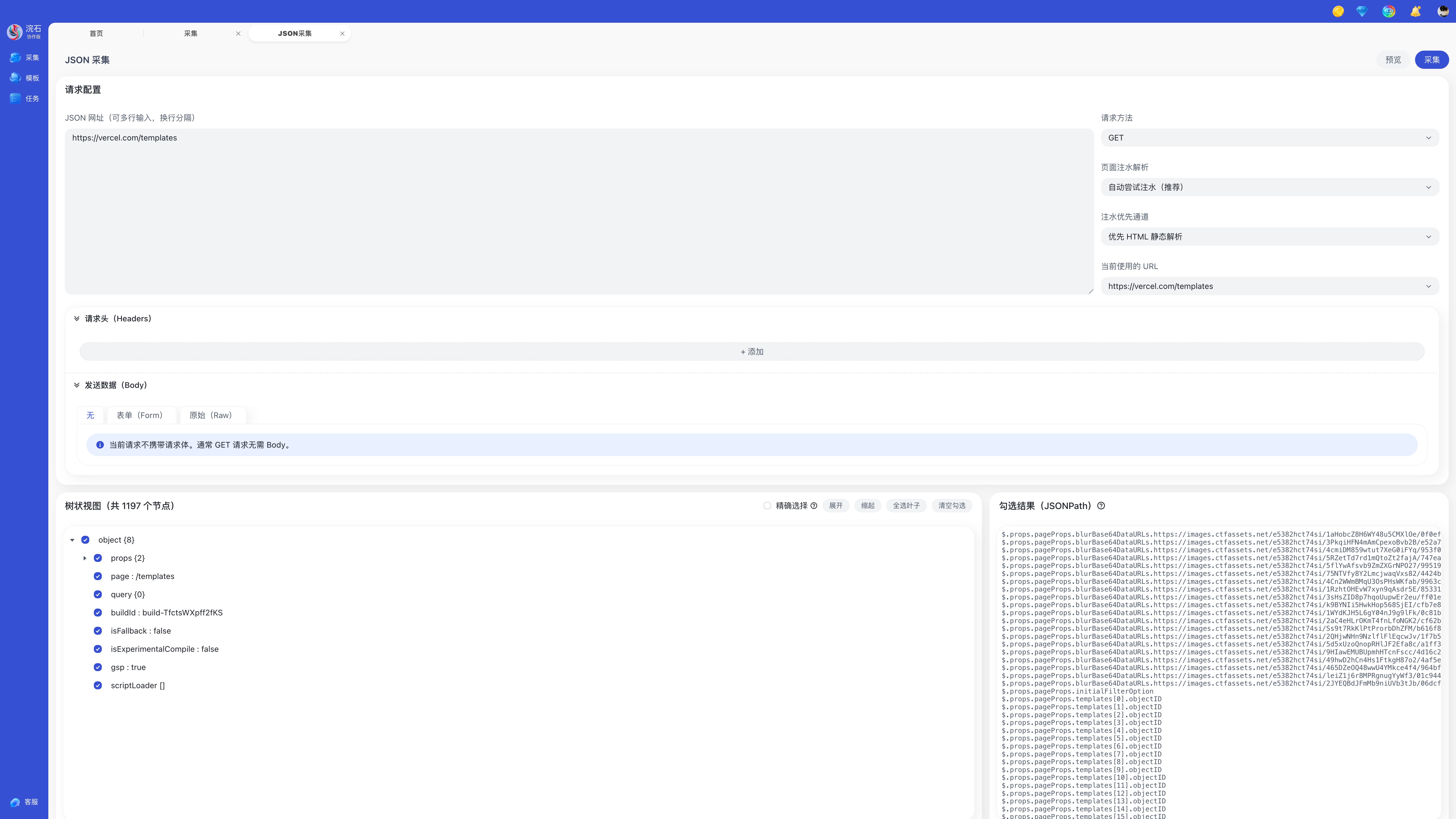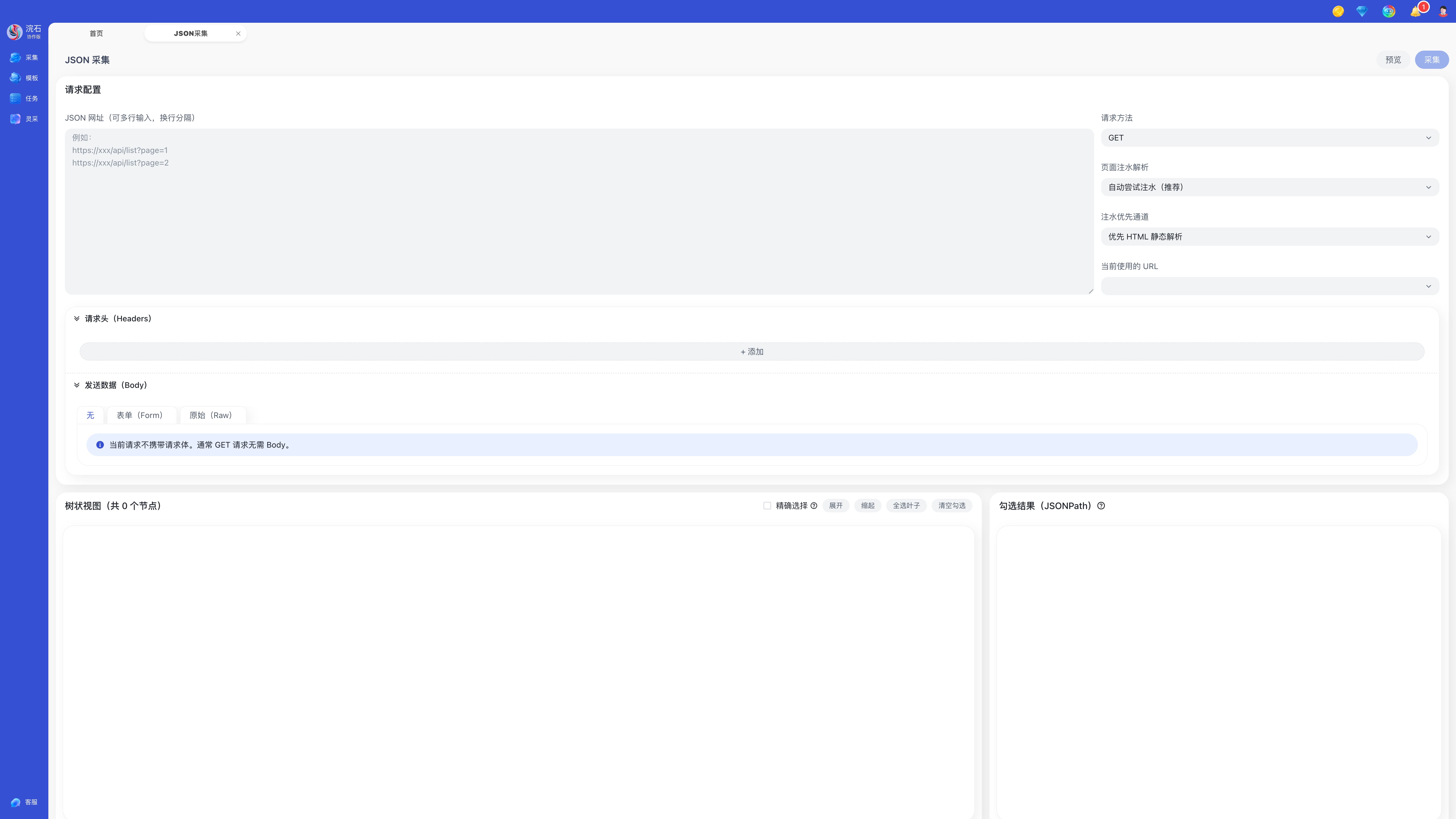 JSON 采集提供了一种面向接口数据的结构化采集方式。您只需要输入 JSON 地址(支持多行),配置请求方式、请求头与请求体,即可预览返回的 JSON 数据结构,并通过 JSONPath 提取所需字段,快速生成结构化结果用于导出与分析。