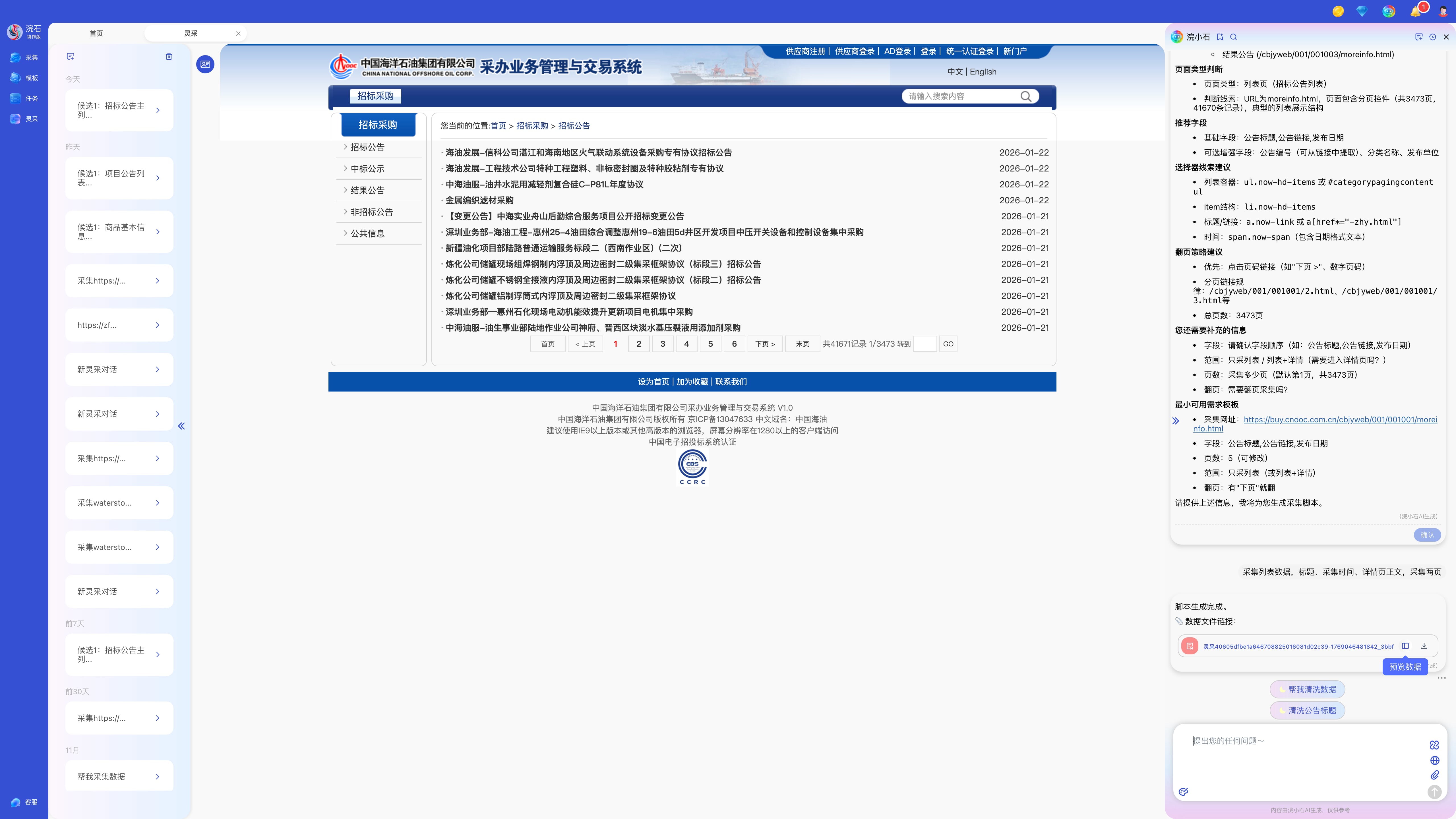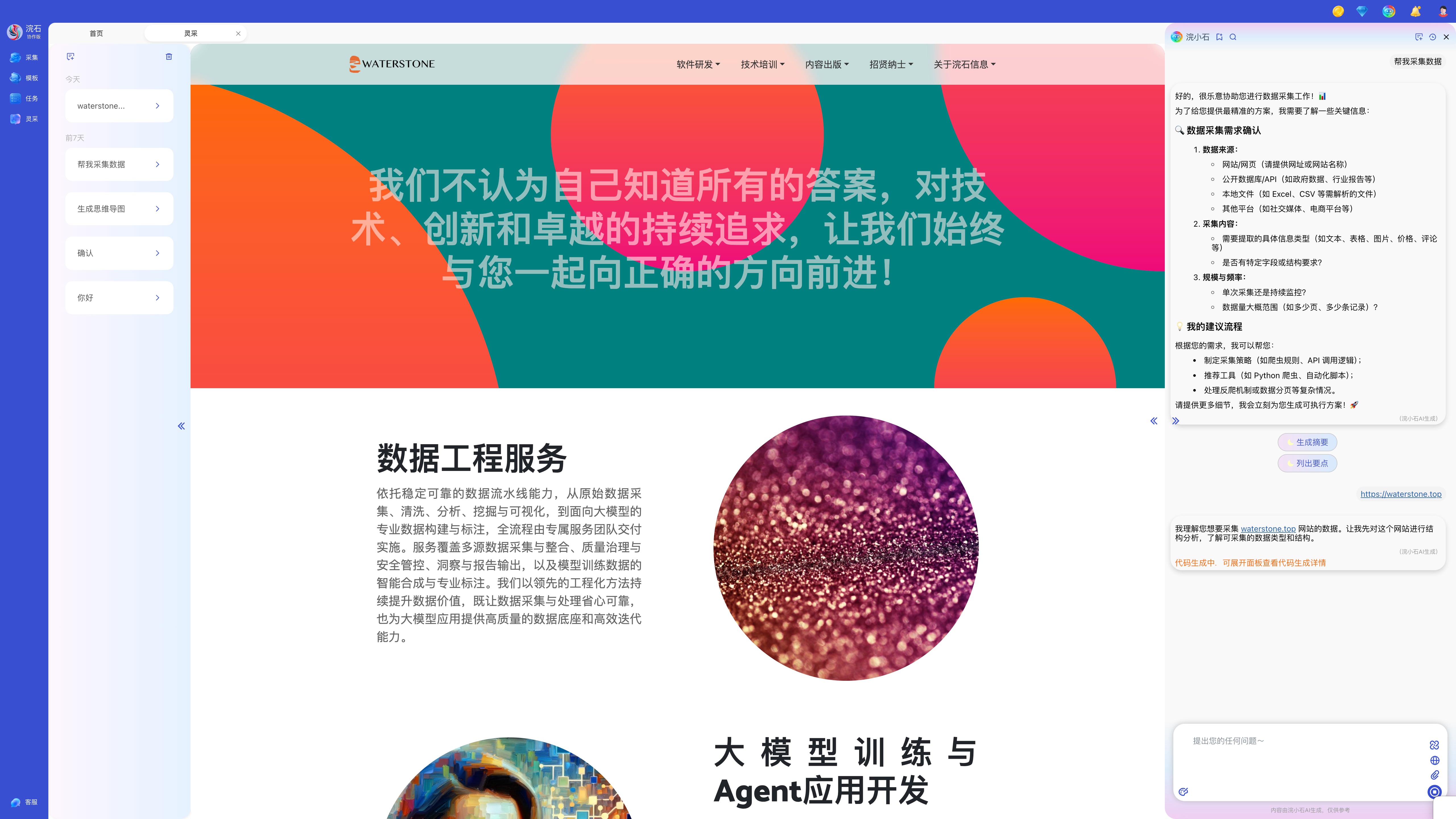 灵采模块开启了全新的数据采集模式。只需在对话窗口输入目标网址和您的采集需求,系统即可智能理解页面结构,自动完成数据采集。